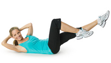 TRAINER’S TIPS Focus your mind on feeling your abs do the work. Keep your neck lengthened. Keep your spine in neutral, being careful not to arch it. Find a rhythm in bringing your shoulders and knees together and extending your lower legs as you lower your torso. |