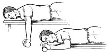 Lie on your right side. Keep your left arm along the upper side of your body. Bend your right elbow to 90°. Keep the right forearm resting on the table. Now roll your right shoulder in, raising your right forearm up to your chest. (Hint: This is like the forehand swing in tennis.) Lower the forearm slowly. Repeat the exercise until your arm is tired. Then do the exercise with your left arm.
