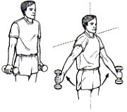Raise your right arm until almost level (about a 45° angle). (Hint: This is like emptying a can.) Don’t lift beyond the point of pain. Slowly lower your arm. Repeat the exercise until your arm is tired. Then do the exercise with your left arm. This exercise is very popular and is commonly recommended as part of a shoulder-injury rehabilitation programme.