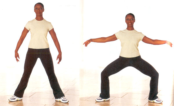 - Bend knees deeply, smoothly bringing the arms down and out to the sides. Then straighten the legs, squeeze the buttocks and quads bring the arms to start position.