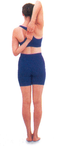 - Place your right palm on your left palm and interlink the fingers of both hands. If this proves difficult, touch the fingertips of both hands to each other. Do not force your arms to bend – give yourself time to adjust to the action. Consciously relax your arms. Open your right armpit to create space between your chest and your upper right arm. Keep your right elbow pointed up and back, and your right forearm close to your head. Lower your left elbow further. Then place the back of your left wrist on your back. Hold the pose for 20-30 seconds. Repeat the pose on the other side.