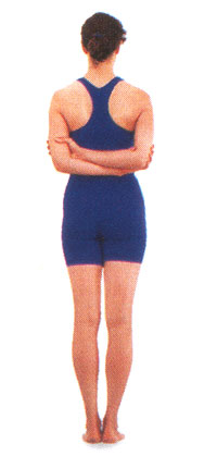 - Stand in your bare feet in Tadasana on an even, uncovered surface. Take your right arm behind your back, and hold your left arm just above the elbow. Bend your left arm and take it behind your back. Stretch both legs and imagine you are pulling the skin, muscles, and bones of your legs up to your waist.