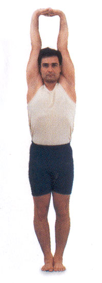 In this pose, the brain is relaxed but alert, and you are aware of the intense stretch of your whole body, from your feet to your interlocked fingers. Feel the energy flow upward from your feet to your knuckles.