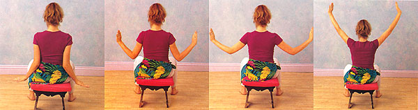 - On an out breath, stretch your palms to the sides with arms raised as high as you can, engaging your upper arms and back muscles. Finally, repeat the arm movements in reverse order, moving down until your arms are beside you. Repeat the whole sequence several times.