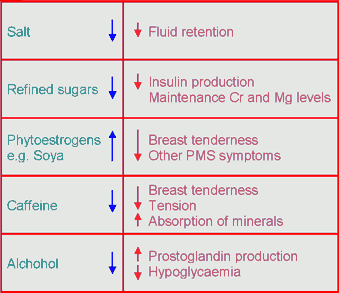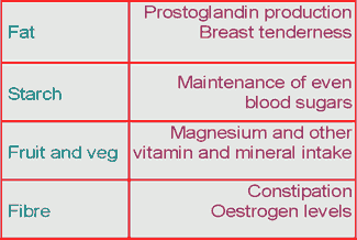 Experience has proved that regular complex carbohydrate intake is a very helpful approach to reducing many PMS symptoms such as dizziness, irritability and shakiness. Some researchers are now looking at using foods with a low Glycemic Index (i.e. slowly absorbable starchy foods) to provide a lower glycaemic load, thus providing an even supply of long lasting energy.