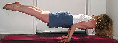 - Now stretch the legs backward and lower the head in order to touch the ground and simultaneously raise both legs from the ground. The entire body will be supported on the palms.