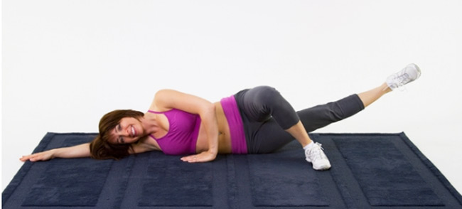 Lie on you side with your legs straight, keeping your thighs together and hips facing forwards. Rest your head on your hand. Keeping your hips forward. Tighten your abdominal and buttock muscles and raise the top leg for 4 counts, then lower for 4 counts, Repeat on the other side.