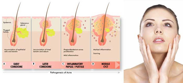 Acne is caused by the over-production of sebum, an oily substance secreted by the sebaceous glands in the skin. Normally, the sebum drains into hair follicles and flows out through the follicle openings on the skin’s surface, thereby keeping the skin lubricated and supple. However, when the glands produce excess sebum, the follicles become blocked. If the sebum remains clogged in the follicle openings, it hardens and becomes dark, forming plugs called blackheads. In some cases, follicles are sealed by an excess of keratin, the tough, fibrous protein produced by the skin cells. When this happens, the trapped sebum hardens into white lumps, called whiteheads, under the surface of the skin. In both types of blockage, bacteria multiply in the sebum, causing inflammation of the surrounding issues.