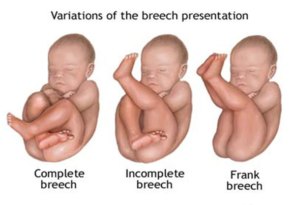 There are three types of breech presentations, frank, complete, and incomplete. With a frank breech the legs are flexed at the hips and extended at the knees so the feet are up by the head. With a complete breech presentation one or both of the legs are extended If the baby is in the incomplete breech position one or both hips are not flexed and the feet and knees are often below the buttocks. The frank breech presentation is the most common of the three and the safest position for a baby to be in if a vaginal delivery is to be attempted.