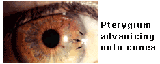 A pterygium is a growth of scar tissue and blood vessels on the sun-exposed surface of the eye in response to ultraviolet damage from the environment. A pterygium often grows in a "wing" shape,, which extends across the cornea towards the pupil. It most often occurs on the inner side of the pupil. Before growing across the cornea there is a scaly red thickening of the conjunctiva known as a pingueculum. Whilst the rednes can be aggravated by wind and other external irritants it is the lack of adequate protection from sunglasses that causes the permanent growth onto the cornea