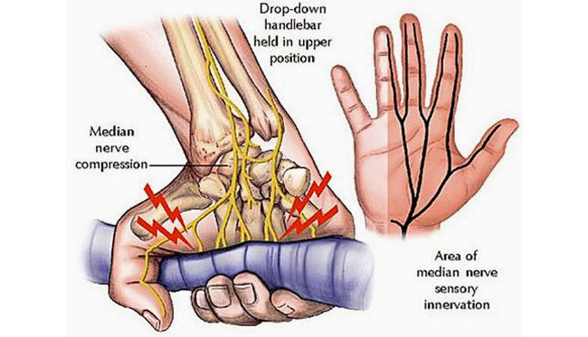 It's important to note, too, that during early stages of the injury symptoms might be limited to tingling (the familiar "pins-and-needles" sensation) while riding with drop handlebars; this distress should disappear if one removes the hands from the lower position on the bars. If ignored, however, the tingling can rapidly progress to numbness and intense pain.