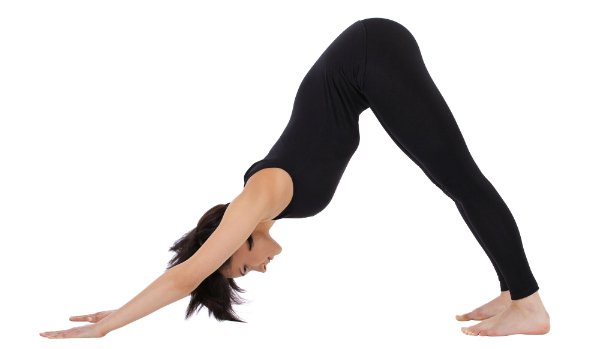 - Spread your fingers wide and create a straight line between your middle fingers and elbows. Work on straightening your legs and lowering your heels toward the ground. Your heels should be slightly wider than your toes, so the outside edges of your feet are parallel with the outside edges of your mat. Relax your head between your arms, and direct your gaze through your legs or up toward your belly button. Work on holding for five breaths.