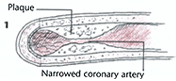 narrowed or blocked by the buildup of fatty deposits (plaque) in a process