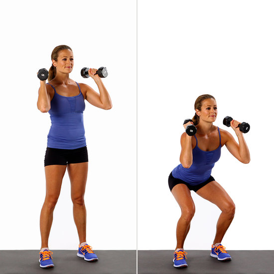 Grab a dumbbell with both hands and hold it in front of your chest, feet slightly more than shoulder-width apart. Keeping your core tight, sit your hips back and bend your knees to lower into a deep squat. Press through your heels to stand, rotating your torso to the left and pressing the weight overhead, your arms fully extended. Reverse the movement to return to squat, then repeat on the other side. That’s one rep. Do 10 times.