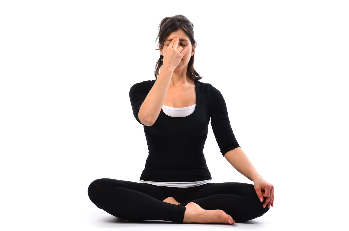 - Place the tip of the index finger and middle finger of the right hand in between the eyebrows, the ring finger and little finger on the left nostril, and the thumb on the right nostril. We will use the ring finger and little finger to open or close the left nostril and thumb for the right nostril.