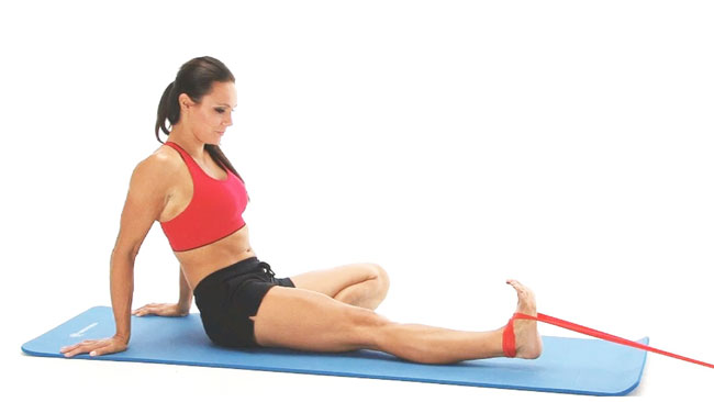 - Sit on the floor with your right leg extended. Wrap one end of a resistance band around the ball your right foot and hold the other end in your hands. Keep toes flexed up.