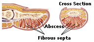 Fingertip pulp is divided into numerous small compartments by vertical septa that stabilize the pad. Infection occurring within these compartments can lead to abscess formation, edema, and rapid development of increased pressure in a closed space. This increased pressure may compromise blood flow and lead to necrosis of the skin and pulp.