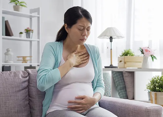 It is a common digestive problem. It occurs as the uterus pushes on the stomach, forcing acid up into the esophagus. Again, eating smaller, more frequent meals rather than three larger meals can help. Avoid bending over or lying flat. Antacids may relieve discomfort.