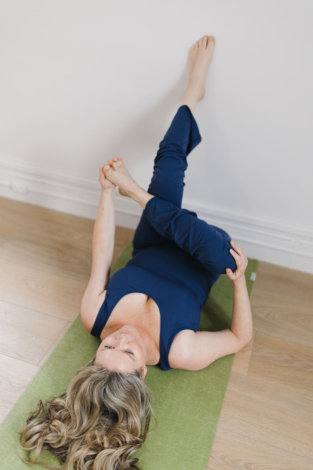 Caption: Lie on your back and extend both legs up the wall, arms relaxed by your sides.