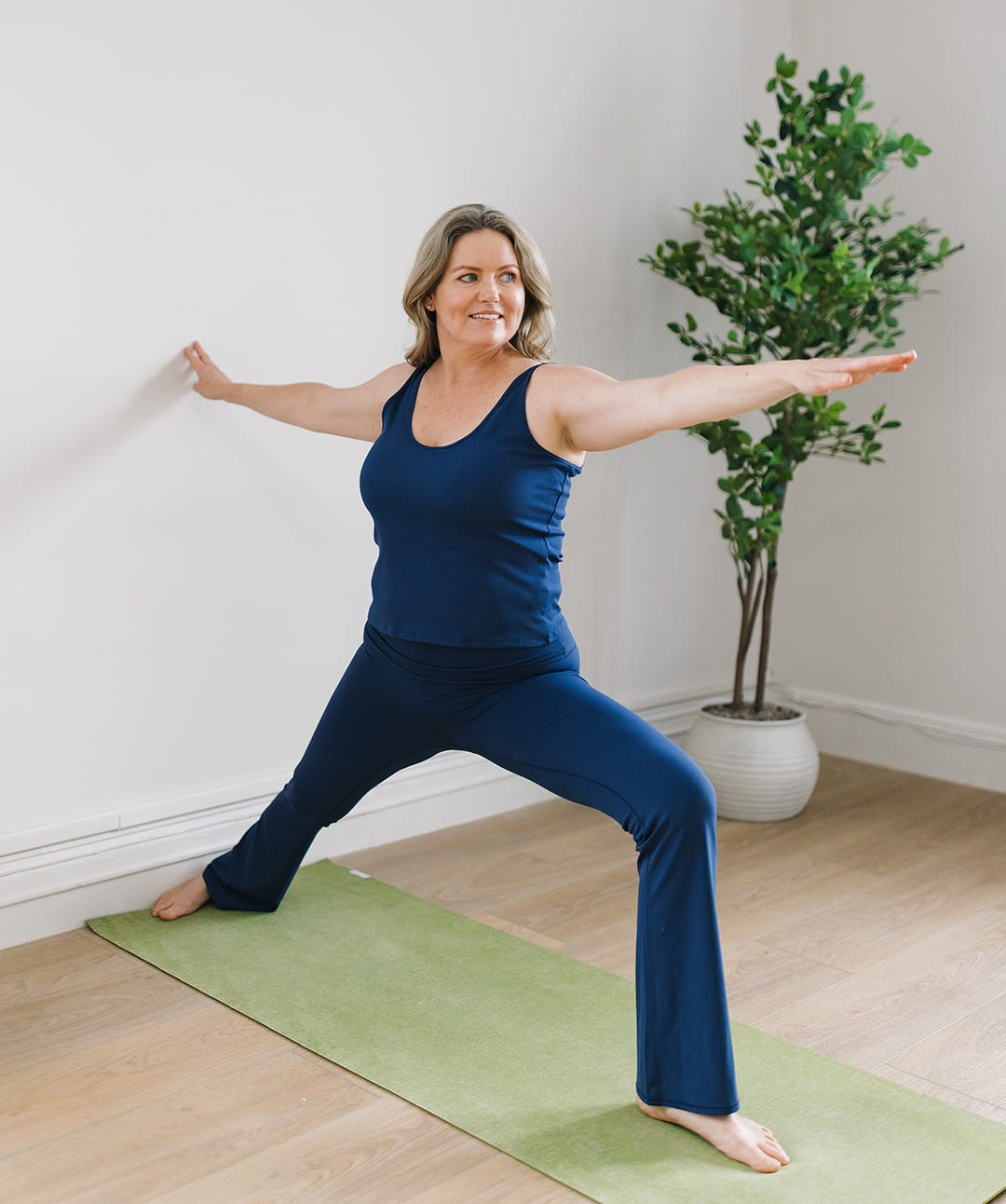 This sequence begins with standing poses to build heat and strength, then transitions into deeper hip work before finishing with restorative support. Repeat the standing poses on both sides to create balanced strength and stability.