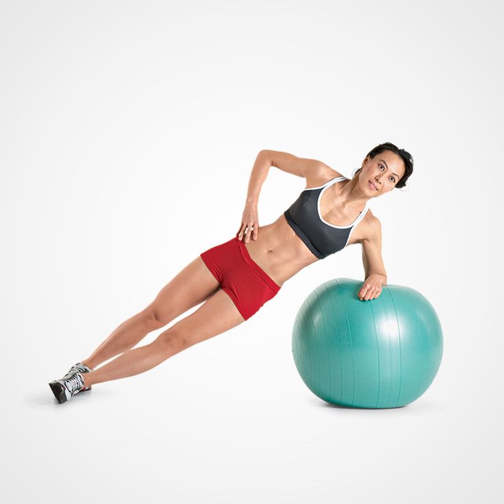 - Position upper body above both hands with right arm straight and left arm bent with hand on ball. Straighten body and place forefeet back away from ball on floor shoulder width apart.