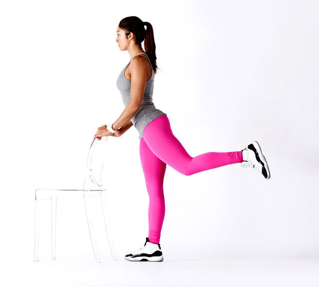 - Move your right leg as far back as you can, concentrating and feeling the contraction in your buttocks. Your knee should be slightly bent.