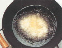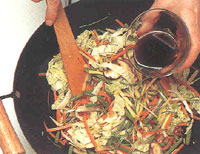 vermicelli noodles are deep fried until crisp, then tossed into a
