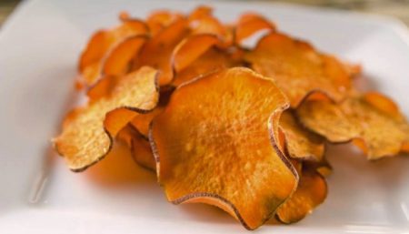 - Slice apples horizontally into very thin rounds, using a sharp knife or mandolin (remove any seeds that do not fall out as you cut). Lay the slices in a single layer on parchment paper, and sprinkle lightly with the cinnamon sugar (combined). Bake at 250°F for 1 hour, flip slices, and bake for an additional hour (2 hours total). Chips will continue to crisp up as they cool.