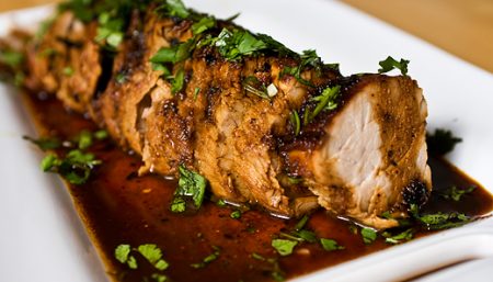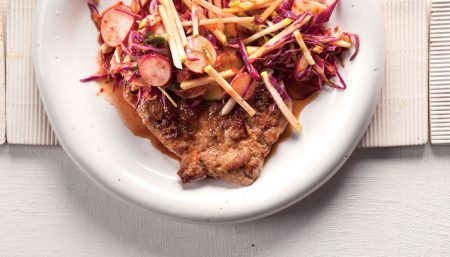 With a sharp knife, slice the steak into thin diagonal slices and arrange on the plates with the garnish.
