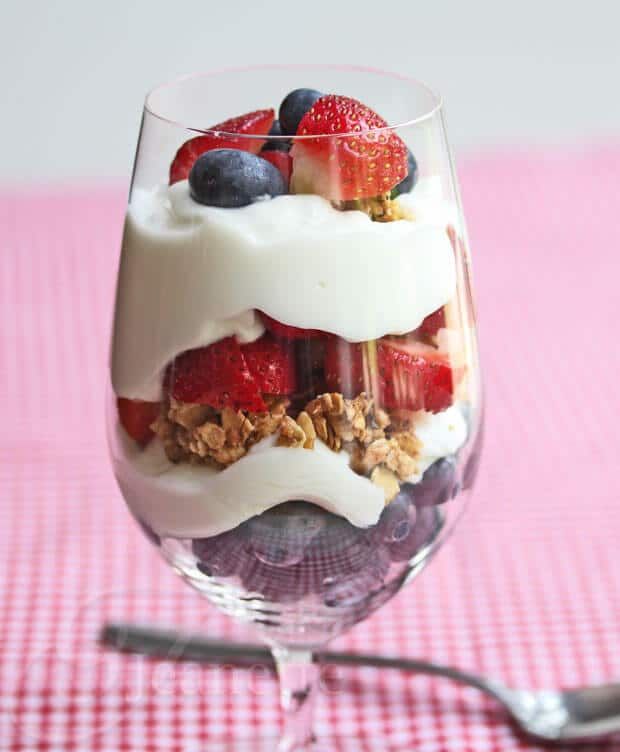 - Spoon 1/4 cup yogurt into four parfait glasses (tall, narrow wine glasses will do) and top with layer of berry mixture. Repeat layers with remaining yogurt and berry mix. Top with granola and nuts. Serve.