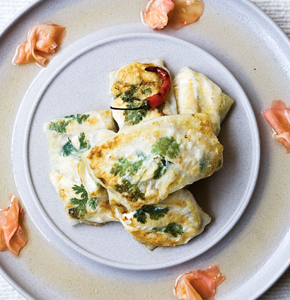 Season the eggs well. Heat a little of the remaining oil in a pan and add a quarter of the beaten egg. Swirl the egg until it covers the base of the pan, and then scatter over a quarter of the reserved coriander leaves. Cook until set and turn out on to a plate. Make three more omelettes in the same way.