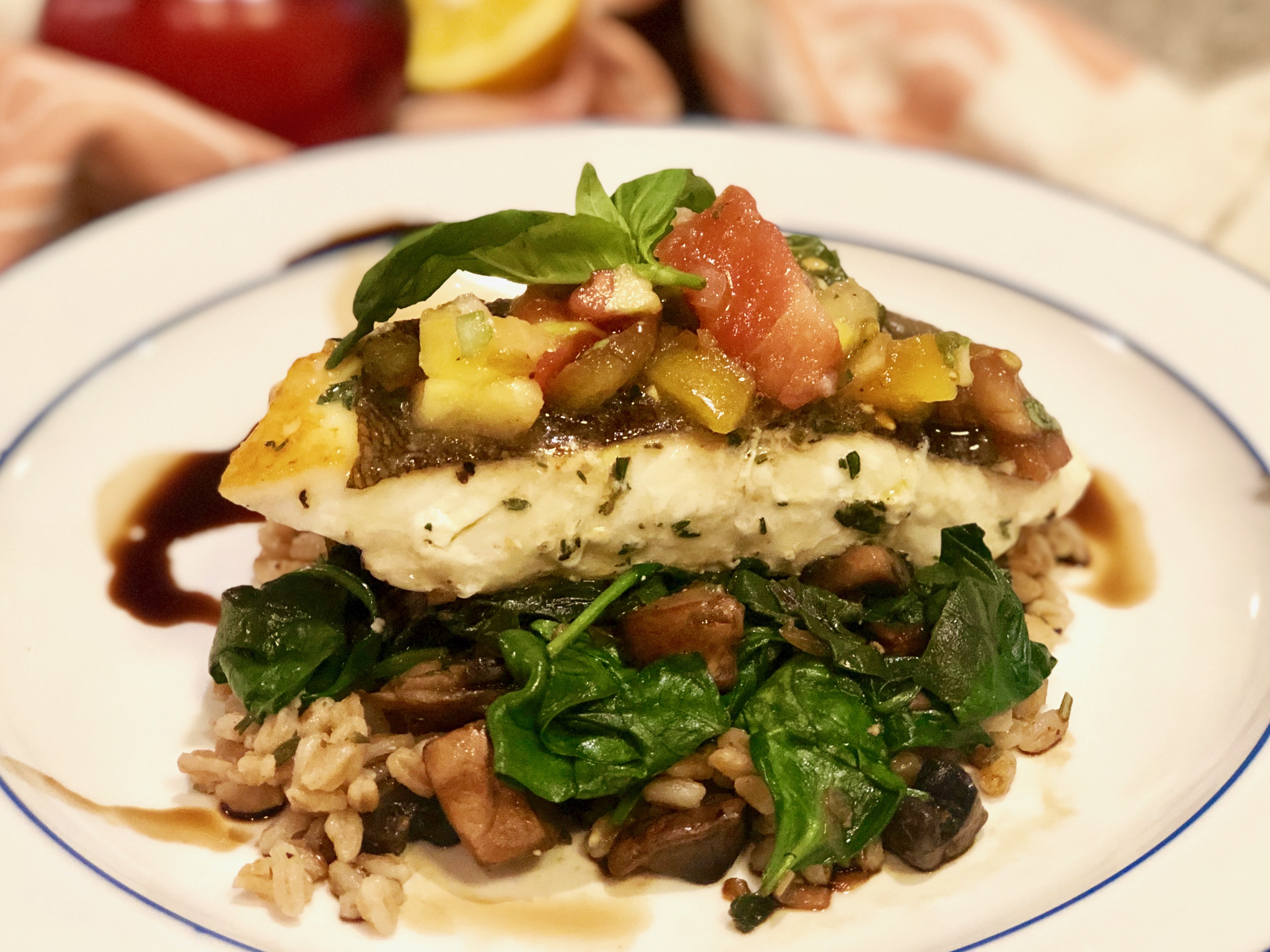 - Transfer the halibut to plates over the grains and greens, and finish by spooning 2 Tbsp of the the tomato mixture on top of each filet.
