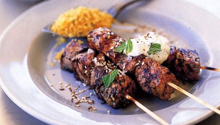 Cook the kebabs over the barbecue or under a preheated grill for 10-15 minutes, turning them once. Use the leftover marinade to brush over the kebabs during cooking to prevent the meat drying out.
