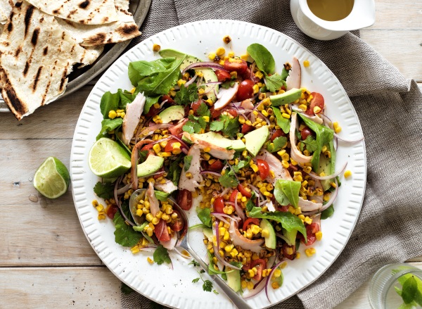 In a large bowl, place chicken, corn, beans, bell peppers and jicama. Gently toss until well mixed and set aside.