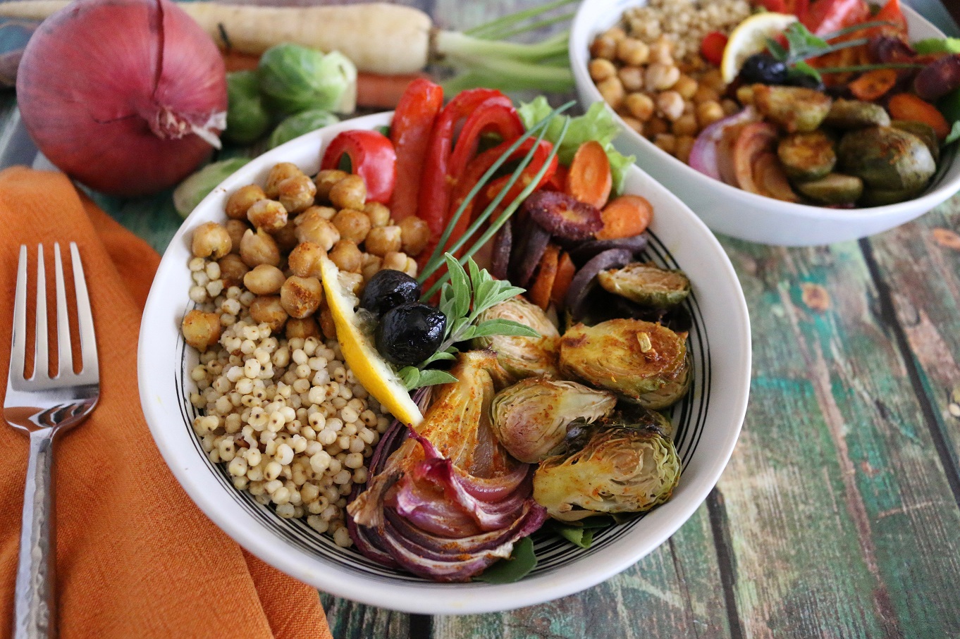- To make each large individual bowl (makes 4 bowls): In each bowl, arrange 1/2 cup cooked sorghum on one side, and 1/2 cup greens on the other side. On each bowl, arrange on top of the sorghum and greens the following: 1/4 of the onions, 1/4 of the bell pepper, 1/4 of the carrots, 1/4 of the Brussels sprouts, 1/4 of the chickpeas, and 3 black olives.