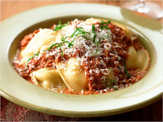 Cook the ravioli in a large pan of boiling, salted water for about 4-5 minutes. (Cook in batches to stop them sticking together.) Drain thoroughly. Serve topped with Bolognese sauce, and hand round grated Parmesan cheese separately.