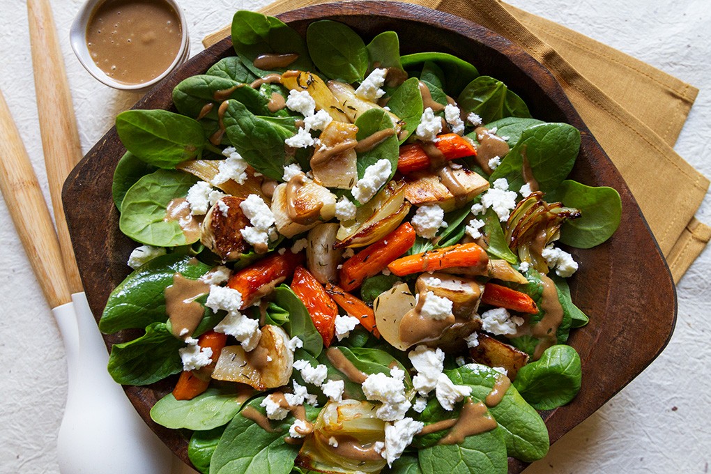 - In mixing bowl, whisk vinegar, lemon juice and Dijon with remaining oil and stir in parsley, cilantro and walnuts. Drizzle dressing over vegetables and gently toss. Top with crumbled feta. Serve warm or at room temperature.