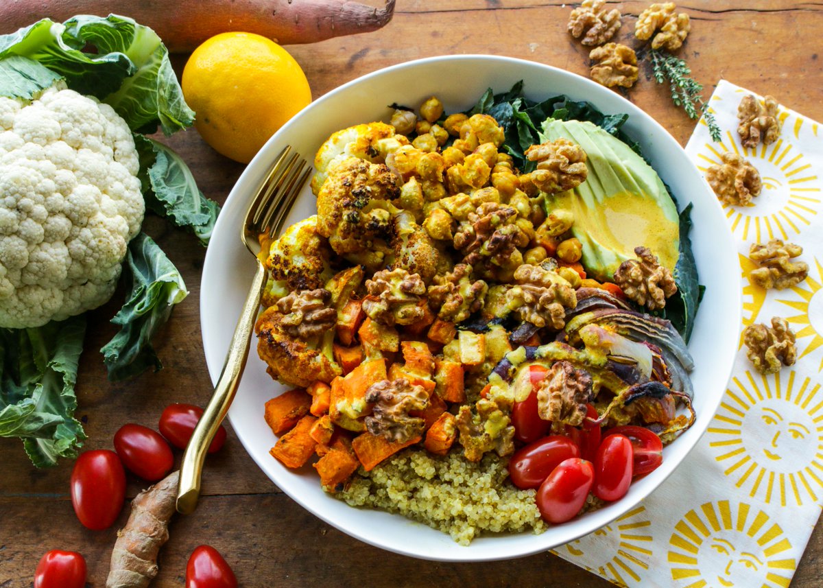 - Drizzle olive oil and lemon juice over vegetables. Sprinkle with curry powder, turmeric and salt (if using). Toss together with tongs to distribute.
