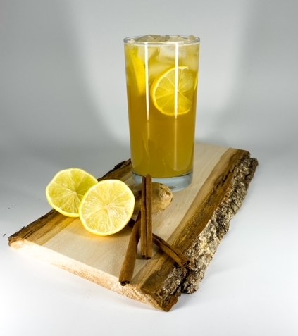 - Strain Ginger root and honey mixture into highball glass with ice. Stir in remaining ingredients. Garnish with a slice of lemon.