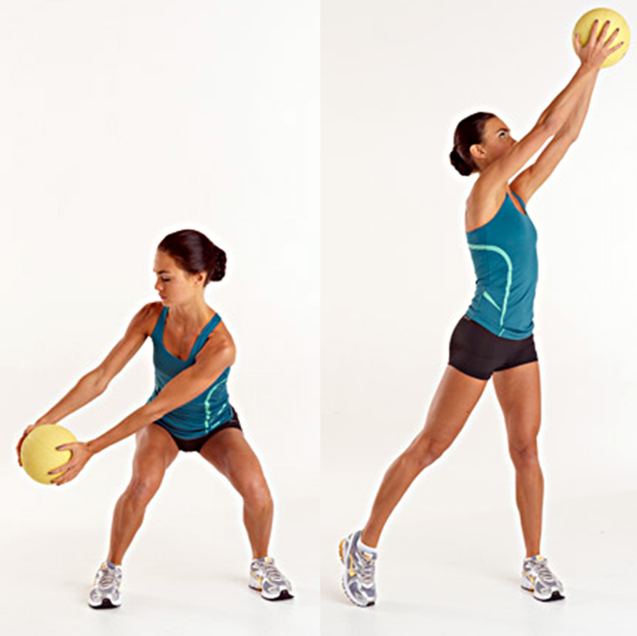 Stand in a split-stance position with your left foot forward holding a medicine ball in both hands. Keep the ball close to your body. Engage your abdominal /core muscles to stiffen your torso and stabilize your spine. Your torso should be upright. Slowly, bring the medicine ball down and across your body toward the right hip. Do not rotate your head, chest, torso or hips, and keep them facing forward. Keep the medicine ball relatively close to your body. Hold this end position briefly before returning to your starting position. Repeat the movement in the opposite direction with your opposite leg forward. - Burpees (Arms, Chest, Core & Legs)