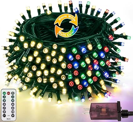 - New Upgraded Extendable Plug in String Lights for Christmas Decor: Warm white and multicolor two colors in one set,super bright with new upgraded LED bulbs. This extendable 200 LED green wire plug in string lights have 9 lighting modes to satisfy your diverse decorative effect. Total length is 82ft, of which 66ft with lights.