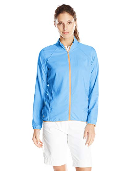 Lightweight, stretch woven fabric. Full zip and two front pockets. Elastic binding at cuffs and hem. Dramatic shirred back.