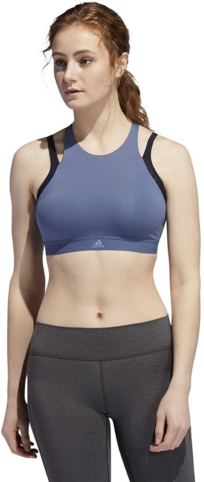 This women’s sports bra has a high neckline for full coverage through circuit training or cycle class. It’s made from smooth, sweat-wicking material, with a strappy back. Removable pads give you the option of extra support and shaping.