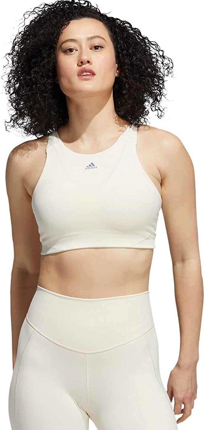 Flow from one pose to the next in this medium-support bra designed for yoga. Super soft, non-restrictive fabric feels comfortable as you bend and twist. Moisture-absorbing adidas AEROREADY keeps you dry, and the high neck adds extra coverage for inversions.
