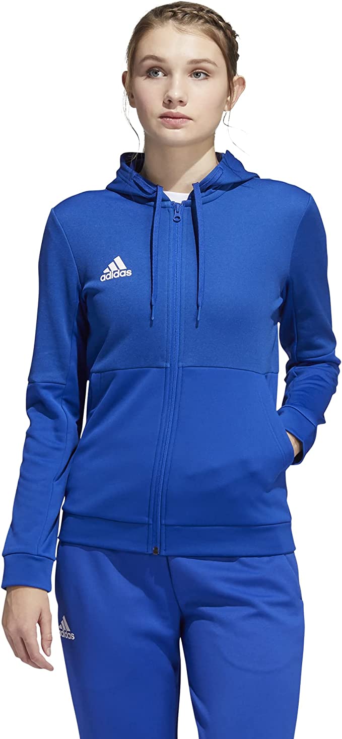 Adidas Women’s TI FZ Jacket – Team Navy Blue/White, FM7689. Made from 72% recycled polyester and 28% double knit polyester. Features two front pockets. Hood adjustable with drawcord. Rubberized high density print adidas logo on front. AEROREADY adsorbs moisture and makes you feel dry.