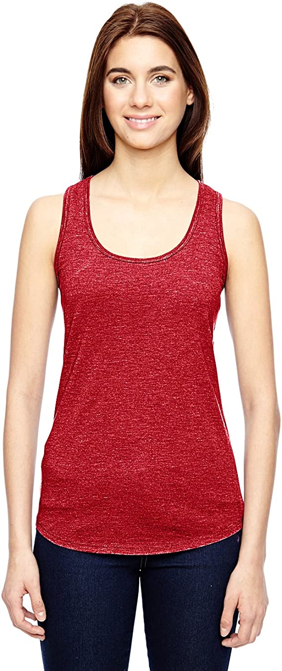 preshrunk 50% polyester/25% combed ring-spun cotton/25% rayon, 4.7 oz., 30 singles, semi-fitted contoured racerback silhouette with side seams, bound-on self-fabric neck and armholes, double-needle curved bottom hem, tear-away label.