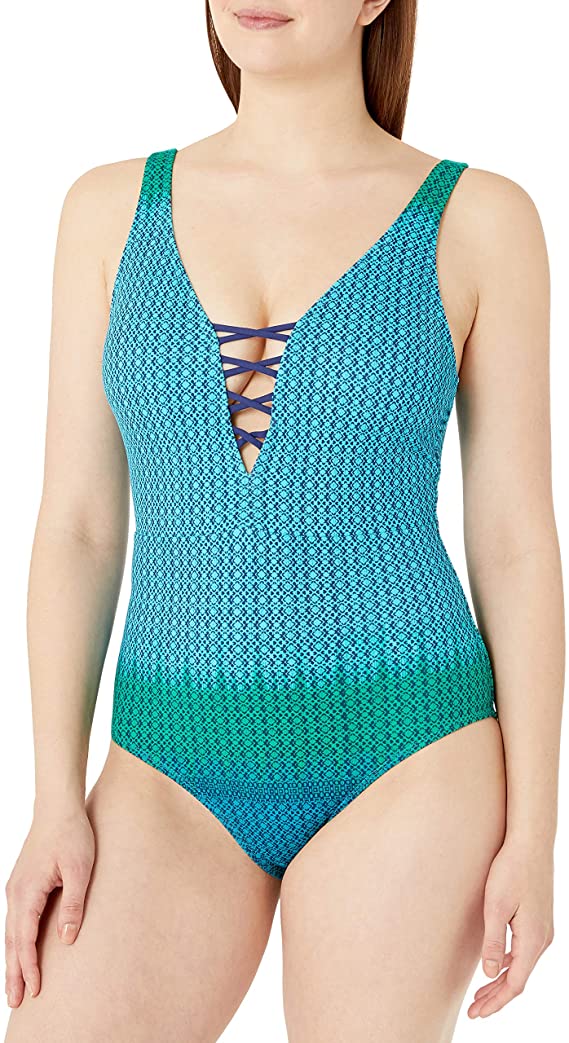 Exude total confidence with tummy control lining, supportive strapping, and modest coverage in the slimming tummy control v-neck one piece swimsuit by Athena.
