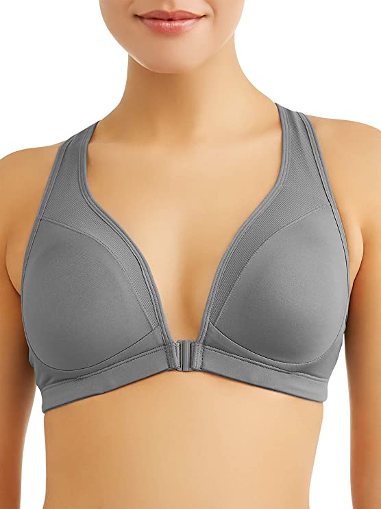 Athletic Works Front Close Plunge Sports Bra is a medium impact sports bra with a plunging neckline, molded cups, front clip closure, moisture wicking fabric, pique mesh details, split back design, feminine shaping and topstiching to accentuate your neckline