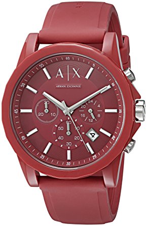 A sporty silicone strap anchors a bold red chronograph dial with silver-tone accents in this unisex watch by Armani Exchange.