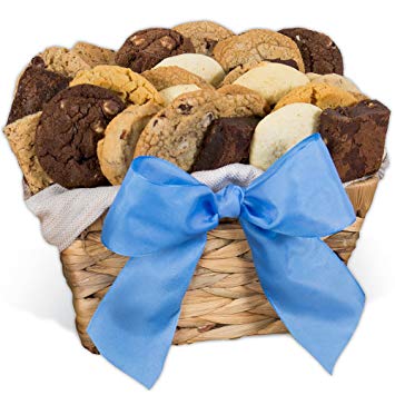 Includes 2 fudge walnut brownies, a peanut butter brownie, 2 chocolate chunk brownies, 2 chocolate chip blondie brownies, a butterscotch blondie brownie, 2 oatmeal raisin cookies, 2 peanut butter cookies, 4 chocolate chip cookies, 2 fudge brownie cookies, 2 lemon sugar cookies, and 2 pecan sandy cookies.
